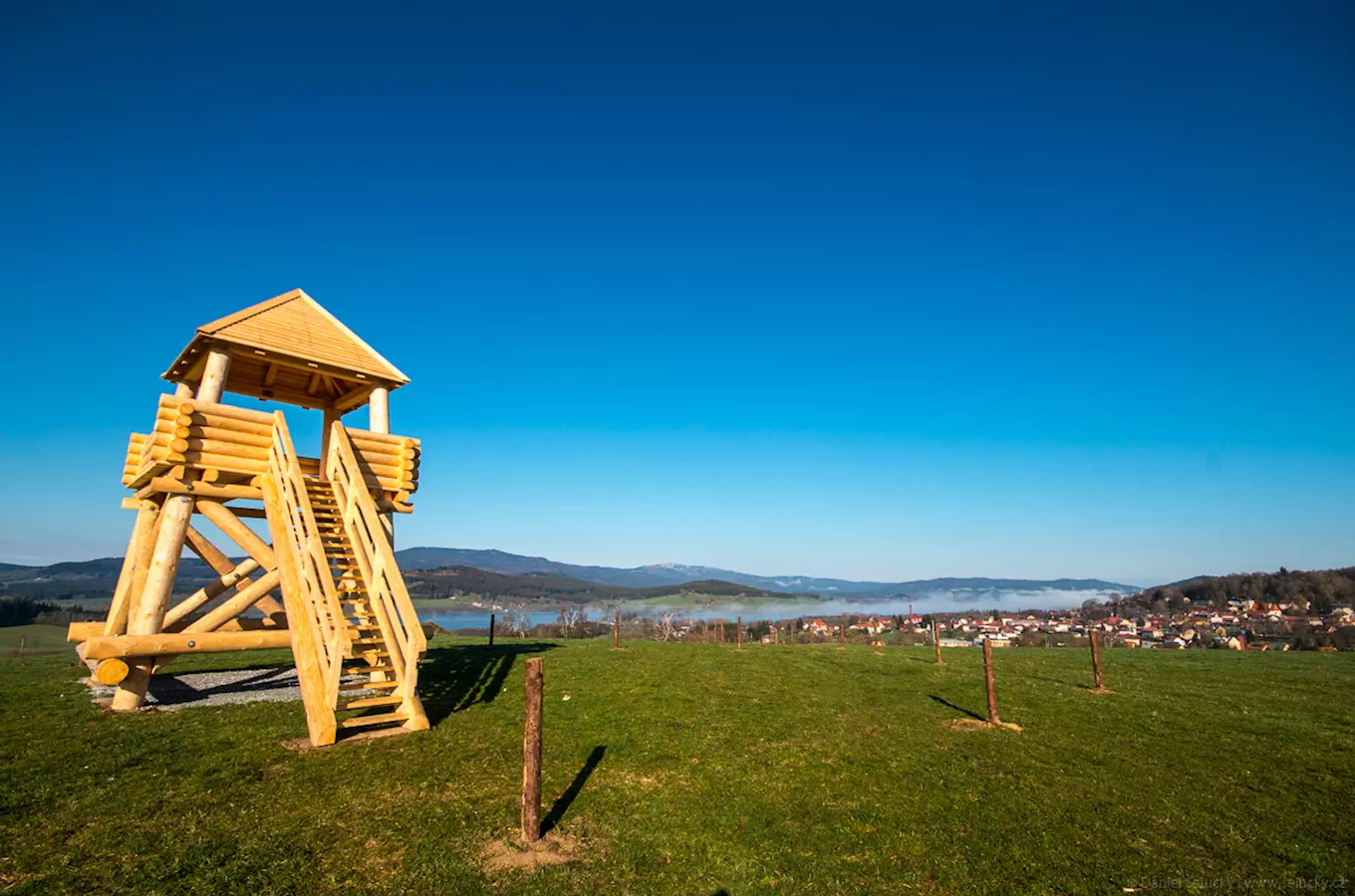 Dřevěná rozhledna asi půl kilometru od Horní Plané stojí v nadmořské výšce 800 m n. m. A že se jedná o mini rozhlednu, dokazují její rozměry – vysoká je celkem 9 metrů a na vyhlídkovou plošinu ve výšce 5 metrů vede pouhých 21 schodů. Na jihu uvidíte hladinu Lipenské přehradní nádrže a za ní Vítkův kámen i zdvihající se hřeben Šumavy s vrcholy Smrčina, Hraničník, Studničná a se svými 1378 metry také nejvyšší vrchol Šumavy na české straně, horu Plechý. Nad městem se vypíná vrch Dobrá voda se "zázračným" pramenem a poutním kostelem Panny Marie Sedmibolestné.